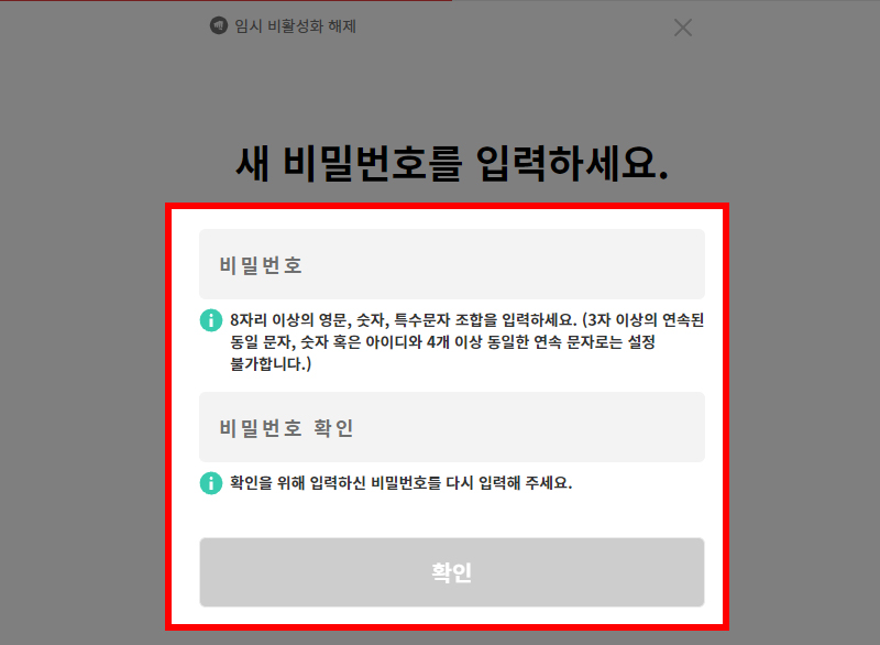 그럼 새로운 비밀번호 설정이 나옵니다. 해킹의 위험이 있으므로 새로운 비밀번호를 설정한 뒤 확인 버튼을 클릭합니다.