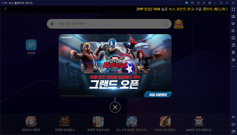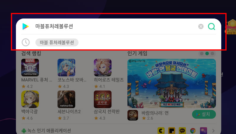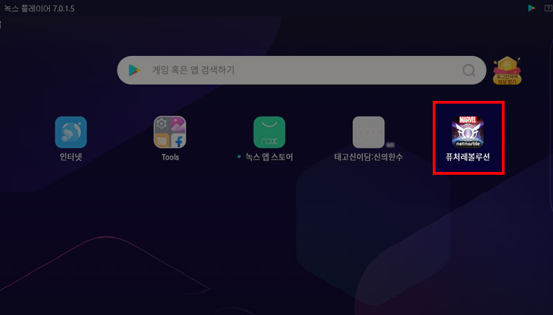 여기까지 과정을 마치면 녹스 첫 화면이 보이는데 현재는 퓨처레볼루션의 다운로드 광고가 바로 보이네요. 클릭하여 바로 설치를 하시거나 검색창에 게임명을 검색한 뒤 설치해주세요.